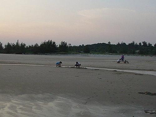 退潮時分,身處開闊的海灘,赤足踏在泥沙上